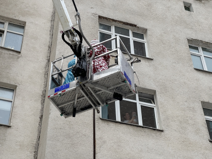 На пожарных подъемниках наряженные в костюмы Дедов Морозов и Снегурочек сотрудники Департамента ГОЧСиПБ поднялись к окнам больницы, радостно приветствуя детей и их родителей, «взрывая» хлопушки и рисуя в воздухе руками сердечки.