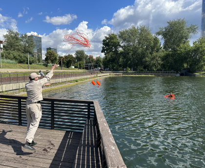 Для успешного обучения работников парка приемам спасения на воде с помощью конца Александрова понадобился условный утопающий – спасатель в гидрокостюме.