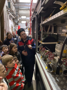 После беседы с детьми о правилах пожарной безопасности гостям показали служебные помещения отряда и рассказали о трудовых буднях пожарных. Экскурсанты узнали, что в учебном классе огнеборцы постоянно повышают свои знания и навыки и проводят разбор потушенных пожаров; в центральном пункте связи принимают звонки о возникших пожарах; на рукавной базе хранят и ремонтируют пожарные рукава.
