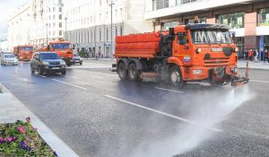 На улицы столицы 20 июня выехало пять тысяч поливомоечных машин. Специальный транспорт поливал проезжую часть в столице из-за жары каждые два часа.